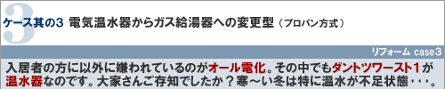 電気温水器は充分にお湯が使えないという苦情が多く、また水漏れなどの怖い事故が多発しています。しかし。都市ガス用給湯器に変更するのに非常にコストと時間がかかり大変でした。そこで、当社はプロパンガスへの変更をご提案いたします。イワタニガスとの業務提携により、電気温水器の取替費用並の価格で(全室取替えた場合)ガス給湯器一式の工事ができます(工事費・本体含む)。さらに後々の補修も格安!アフターフォローも万全!「プロパンを外に置くのはちょっと・・・。」しかし、地中に埋め込みフェンスで囲む等、今は外観を損なわない方法が色々とありますので、入居者の方々は安心してお湯を使用していただけます。これで、入居率アップ間違いなし!
